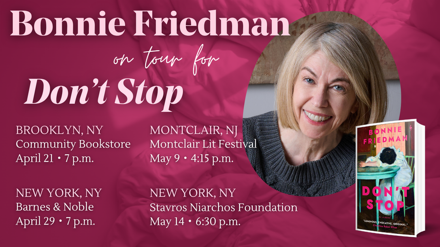 Join celebrated writer and essayist Bonnie Friedman on tour for her debut novel Don’t Stop, a luminous, erotically charged novel about ambition, desire, and the dangerous pursuit of self-knowledge, set in Brooklyn and Manhattan at the turn of the millennium.